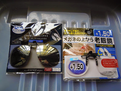 Bought these 2 pairs of clip-on spectacles at Daiso Chinatown Point today... The left is sunglasses (claiming to have 1% or less of UV ray transmissivity), while the right is reading glass of index +1.5 (think is too high for me... maybe next time get a lower number one)... Will need to trim the sunglasses... too big... Bought the sunglasses for reminiscence sake, as I remember when I was very young, I also got a similar pair... and quite fun...