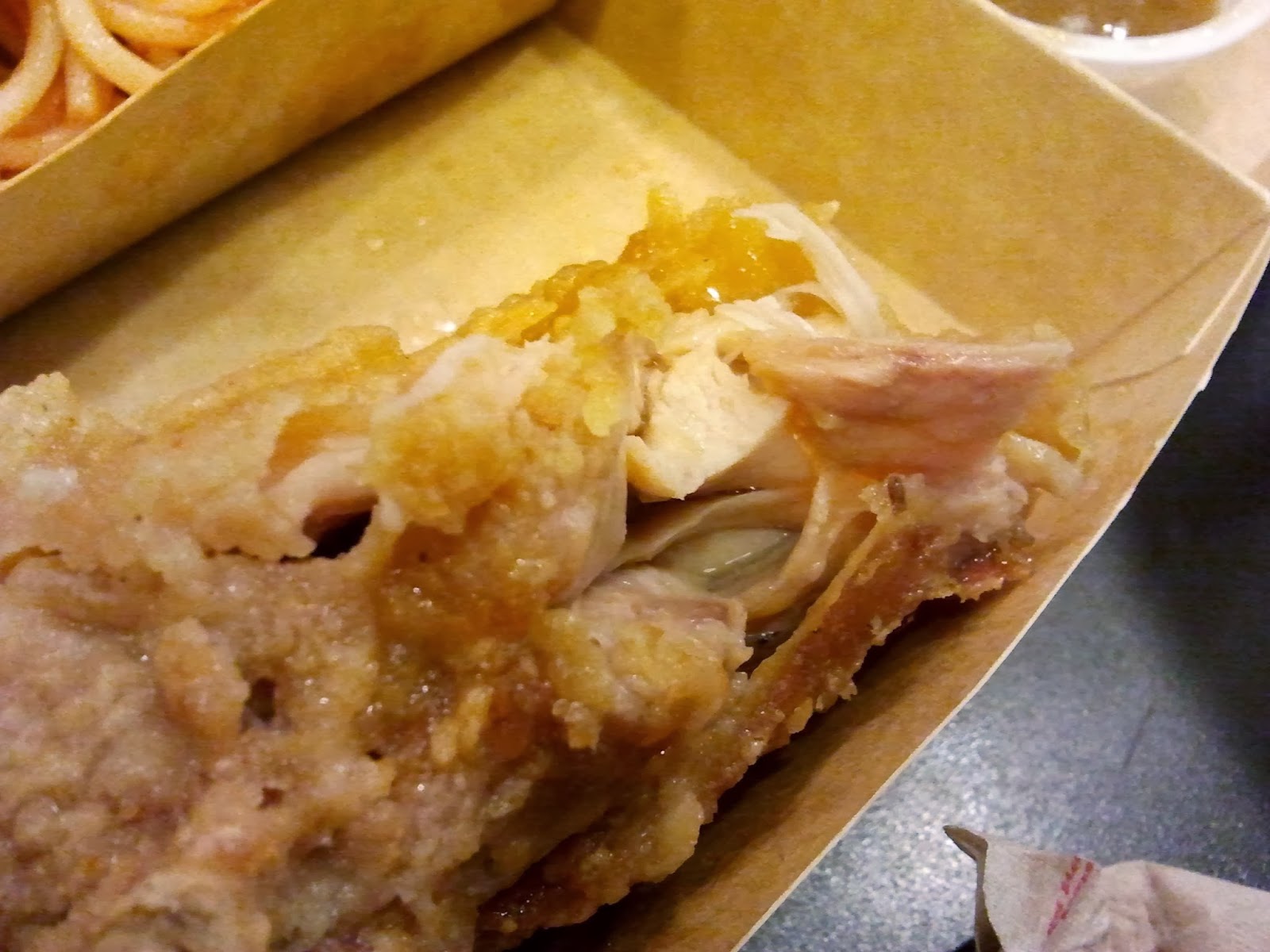 Next, the fried chicken... The piece of chicken is GOOD!!! A very thin layer of batter/flour makes it crisp (but a bit of oily), and the meat inside is tender and JUICY!!!!! The marinate is also quite home-style, not much of the typical "factory-artificial" ones that you taste in many fast food restaurants... NICE.... A good mix when eaten together with either the brown sauce or the spaghetti, as these 2 both are sweet in nature, blends well with the savoury chicken.... Yummm....